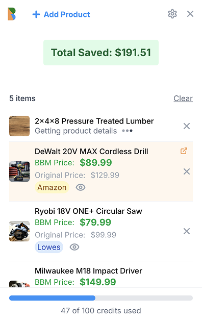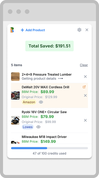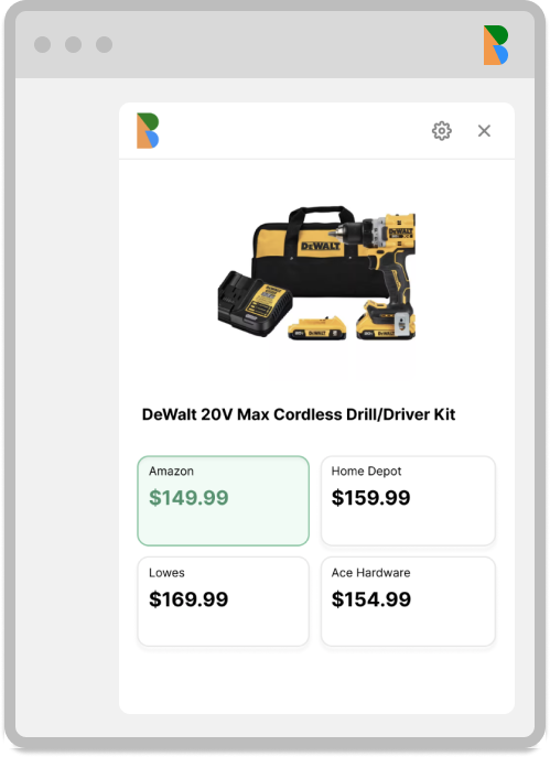 Instantly get the best priced product across Home Depot, Lowe’s, Amazon & Ace Hardware.